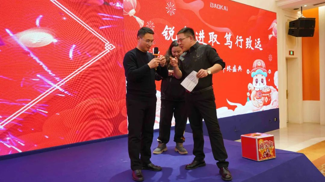 當晚,寶開2025年終盛典在白金漢爵大酒店召開。營銷部宋龍、財務(wù)部丁俊營擔任主持人。